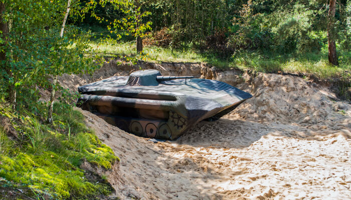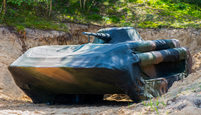 The inflatable mockup is designed to simulate individual objects or groups of equipment in mixed (mockups and real equipment) or simulated (only mockups) conditions. Inflatable mockups simulate the presence of the equipment in a wide spectrum of electromagnetic radiation used in the reconnaissance, i.e. in the visible, thermal and radiolocation range.