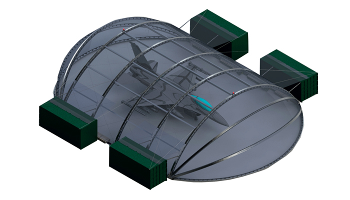 The M4 is designed to offer mobile sheltering solutions under any weather condition. The hangar is optimal for fi eld service of military aircrafts and vehicles. The structure is mobile and can be equipped with ballistic and stealth protection against radar and infra-red threats. The shelter can also be equipped with insulations layer for heating and cooling purposes.