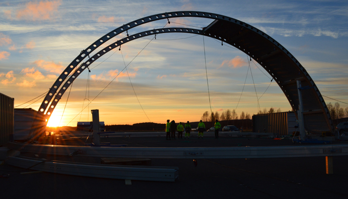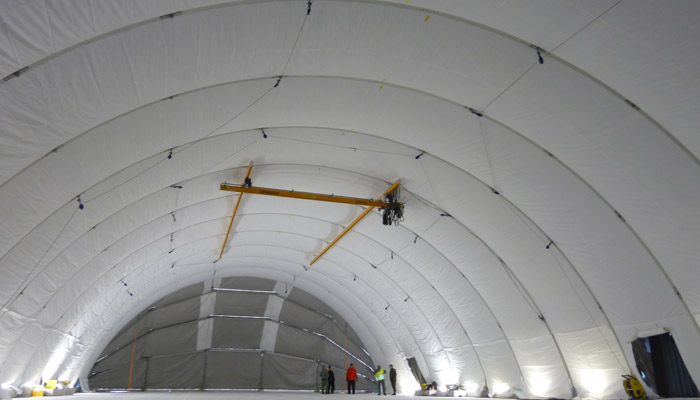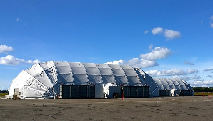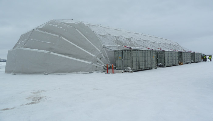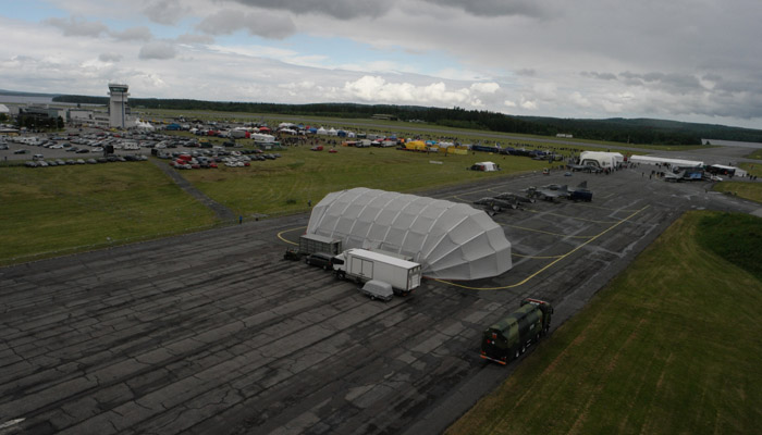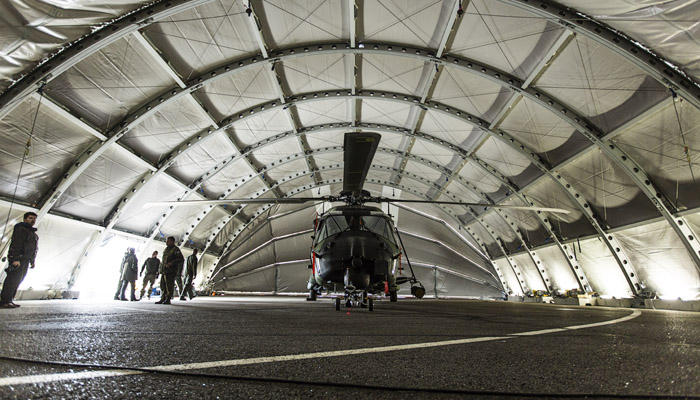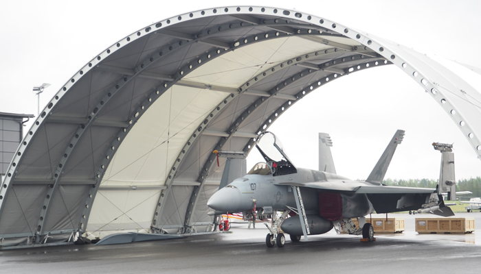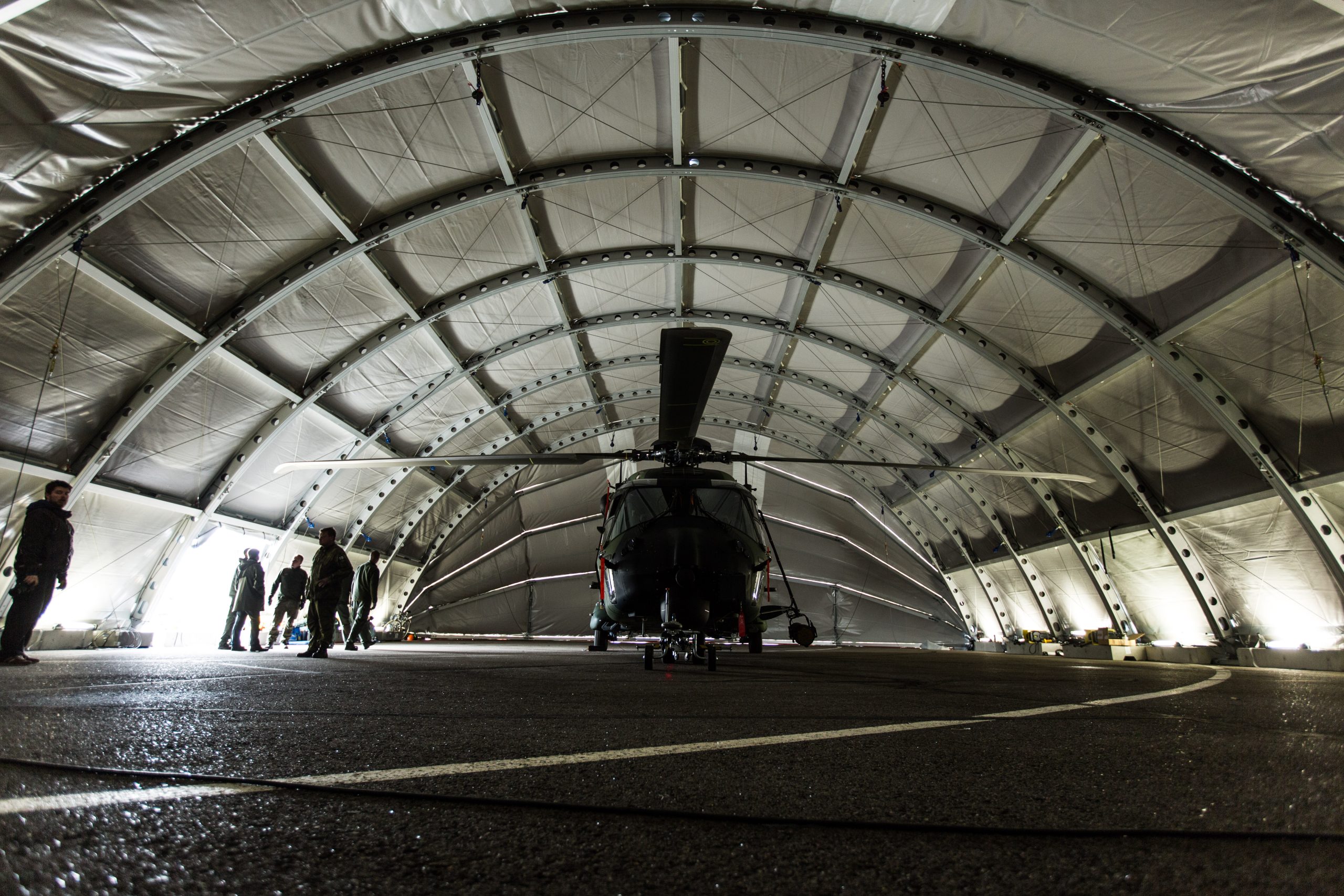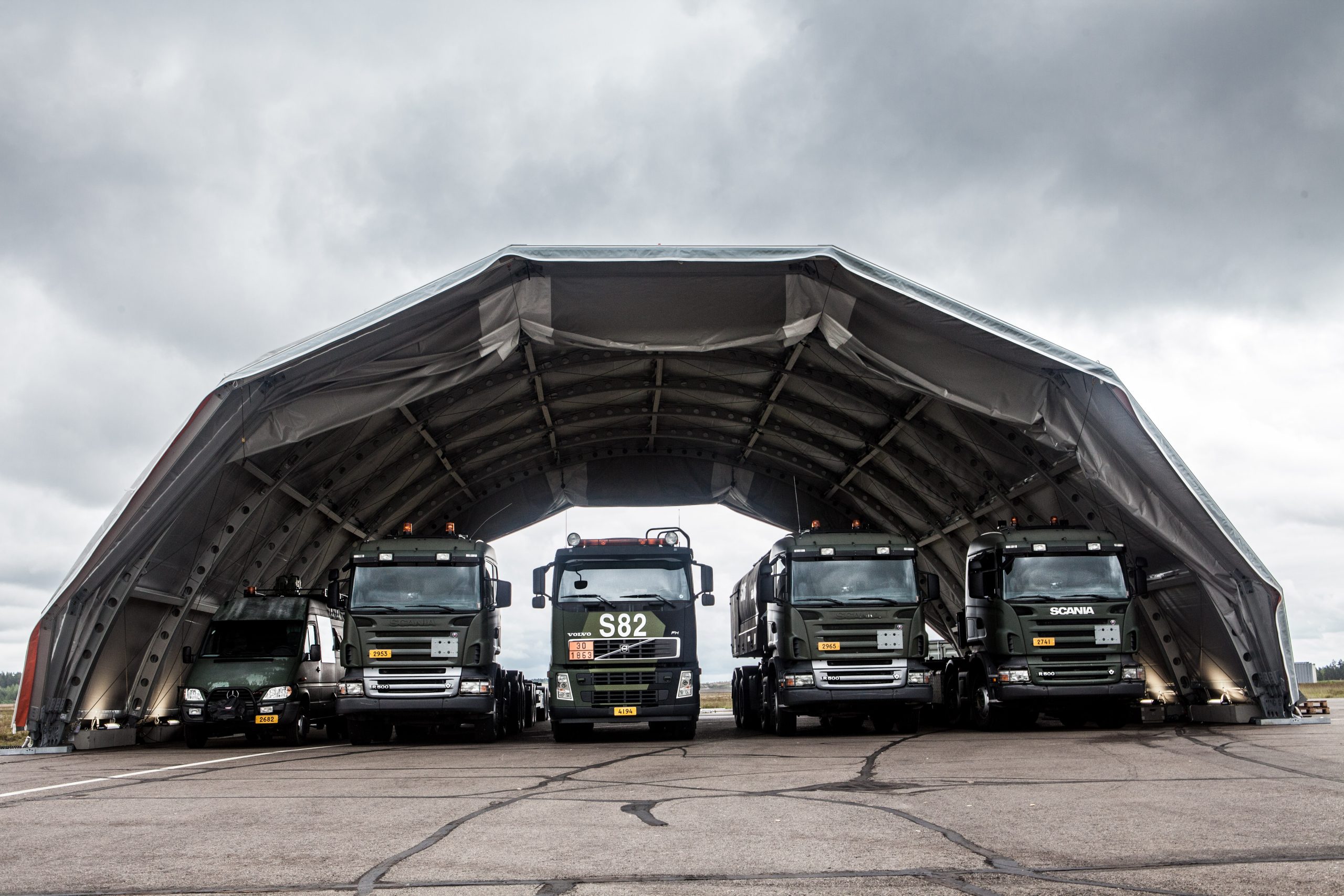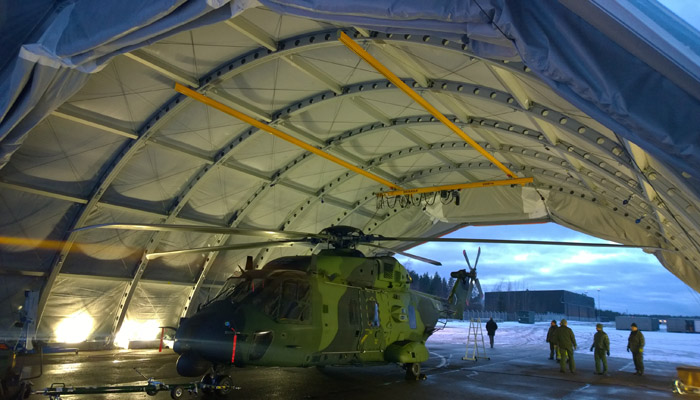 The M5 shelter are used by the Finnish defence forces to shelter and enable maintenance for F18-Hornet fi ghter aircrafts and the NH-90 Helicopters. The military call-sign is F563. It is designed to be mobile, rapidly deployable in any situation and climate. The assembly and disassembly can be done without heavy machinery, scaffolding, cranes or even electricity.