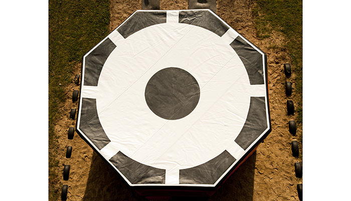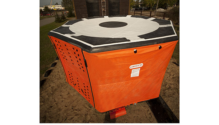 The structural basis of the jump cushion is a frame made of air-tight rubbercoated fabric. The jump cushion expands automatically when the compressed-air cylinder is opened. The frame automatically rises and assumes the shape of the cushion. Simultaneously, the inner compartment is filled through the openings in the side walls of the cushion. When the falling body comes in contact with the surface of the landing area, the pneumatic frame deforms and bends. The volume of the chambers is reduced and the condensed air escapes in a controlled way through the openings in the side walls of the cushion. After removing the load, the air frame rises automatically. After 20 seconds the jump cushion is ready to absorb another jump. The frequency of jumps is determined by the time required for a person to leave the cushion. There is no need to refill it with compressed air. Estimated life of the jump cushion – 15 years.