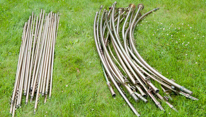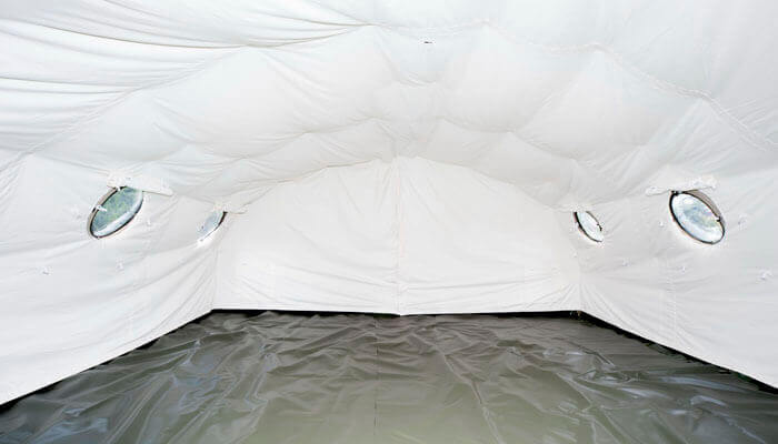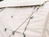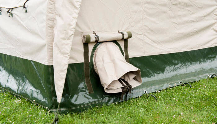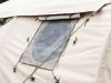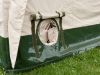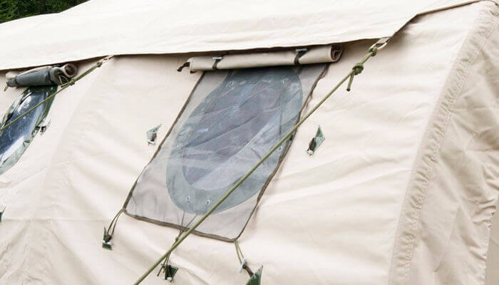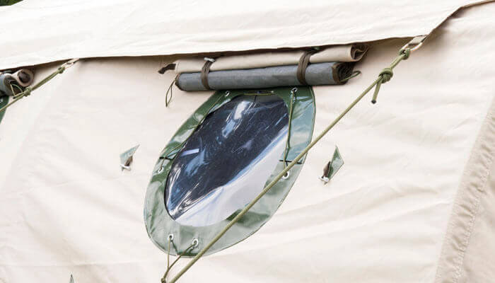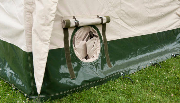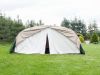 The round windows are made of rigid foil or celluloid and are fitted with chimney metal sheets for the purpose of traditional heating. Two additional sleeve openings can be used to connect heat blowers. The design of the tent enables connecting several tents in series.
