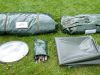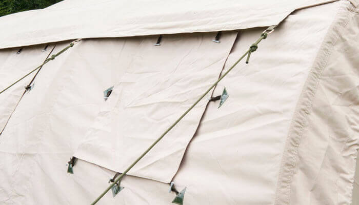 It is made of cotton-polyester fabric with waterproof, antifungal and flame resistant impregnation. It is also made of coated fabric with the highest resistance parameters, as well as functional and operational qualities. The tent consists of an external canopy, a lining, a floor and a steel frame. The shape of the tent resembles a cylinder cut through the middle and the face walls are made of two parts buckled with loops. In the side walls there are window openings with rectangular curtains made of net and the primary material.
