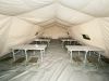 The floor, permanently integrated with the canopy of the tent, is made of flame-retardant PVC coated fabric.