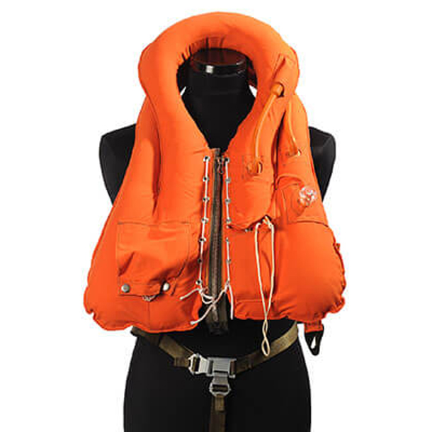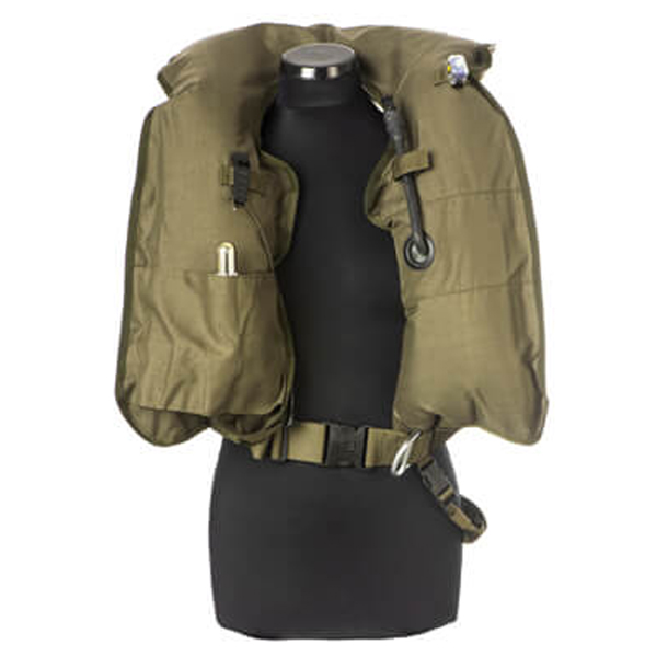 Pneumatic lifejacket with automatic filling system deploying when immersed in water to a depth of 10 cm. Another advantage is the possibility of inflation by mouth. Temperature range -30ºC +50ºC. Vest is able to maintain user on surface of water by min. 6 hours.