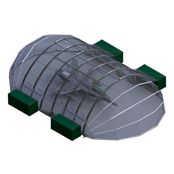 The M5 shelter are used by the Finnish defence forces to shelter and enable maintenance for F18-Hornet fi ghter aircrafts and the NH-90 Helicopters. The military call-sign is F563. It is designed to be mobile, rapidly deployable in any situation and climate. The assembly and disassembly can be done without heavy machinery, scaffolding, cranes or even electricity.