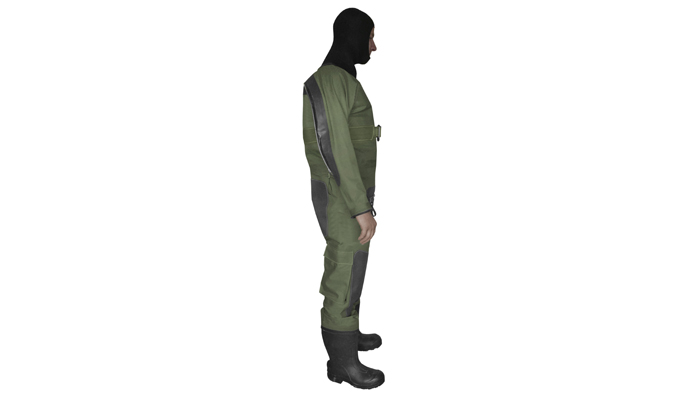 The suit is made of multilayer polyester fabric which is stitched and glued. It is resistant to mechanical damage such as tearing or puncture. It enables performing tasks in waters contaminated with sewage or oil-based products.