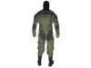 Nonslip rubber pads providing protection against abrasion have been placed on the knees and buttocks areas. Suspenders fastened with buckles have been stitched inside in the waist area. In the upper part of the suit, in the chest area, there is a body belt with a hook for fastening and releasing a lifeline. The colour of the tape used to make the body belt matches the colour of the suit. The body belt comes in a masking colour with a khaki tape, with black buckles and a hook. On the sides of the pants, there are pockets for additional equipment.