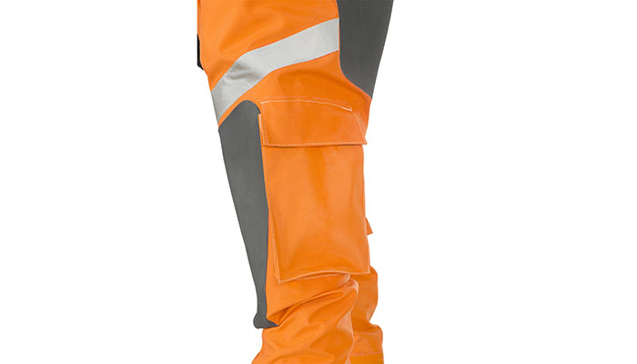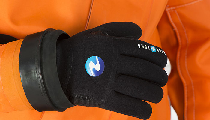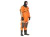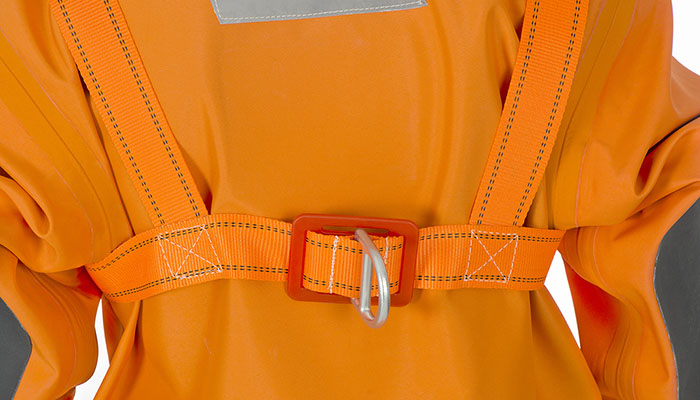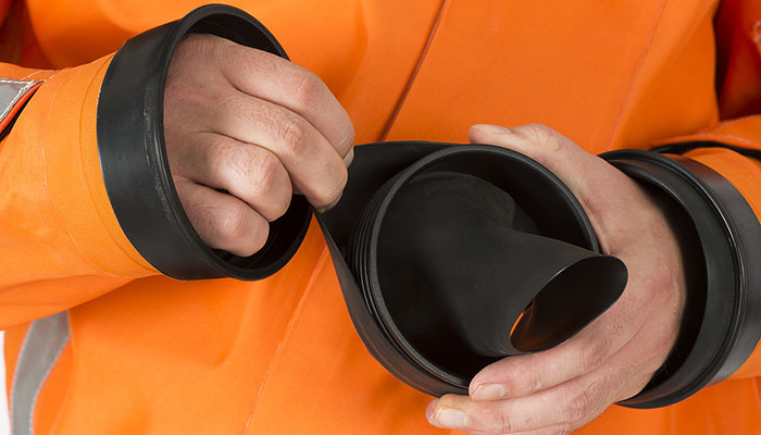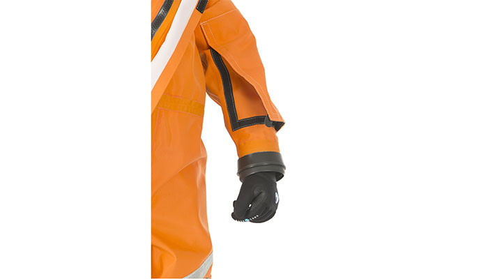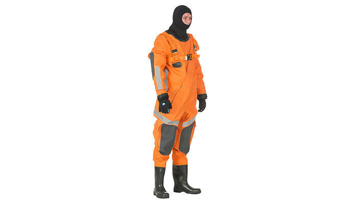 The watertight immersion suit is made of a polyester fabric layered on the polyester knit. It features a waterproof zipper, neck seal, hood and rubber boots permanently glued to the suit legs. It protects the wearer’s entire body against contact with water and offers additional buoyancy characteristics.